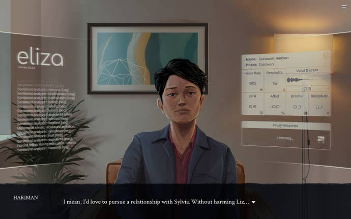 I won't lie: Eliza really affected me. Maybe because I'm in that mid-20s workaholic phase of my life right now. Maybe because I live in San Francisco, a city where tech companies have uprooted and changed neighborhoods for the worse. While some of the people I listened to in my Eliza sessions really annoyed me with their selfish attitudes, Evelyn herself really resonated. I imagine for a lot of players, they'll connect with someone in Eliza's story too.