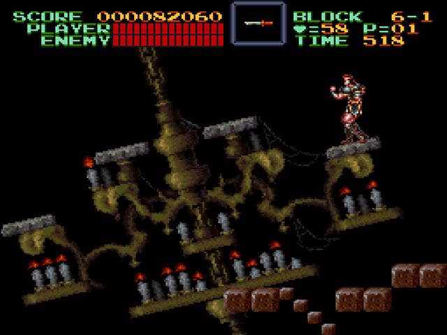 Super Castlevania IV's disparity is part of its appeal, though. The NES Castlevania games share a distinct aesthetic, and the 2D Castlevania titles following Castlevania IV all inherited key traits from their great-grandfather, Rondo of Blood for the PC Engine. But Castlevania IV's subdued color palette, percussion-heavy soundtrack, and loose whip-handling is one of a kind.