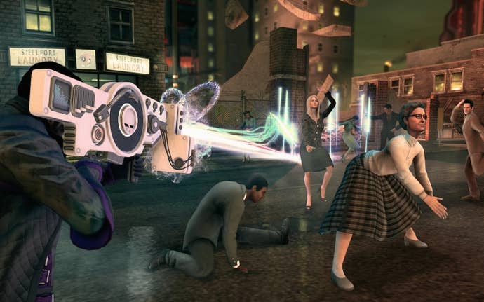 Thankfully, I shouldn't have worried. The sci-fi angle means that Steelport has enough differences to its appearance in Saints Row The Third to make it feel like a completely new place. There's vertigo-inducing alien towers to climb, heavily defended "hotspots" to destroy, and all the cribs you took for granted by the end of The Third are either simply not there or, in some cases, reduced to burning rubble. The Tron-esque digital overlay on everything coupled with the deliberately glitchy graphics (seeing pedestrians with bug eyes and cars that are nothing but wheels and seats never gets old) gives the whole game a distinctive aesthetic all of its own, and the fact that the lighting of the city subtly changes from red to blue as you take control of areas is a particularly nice touch.